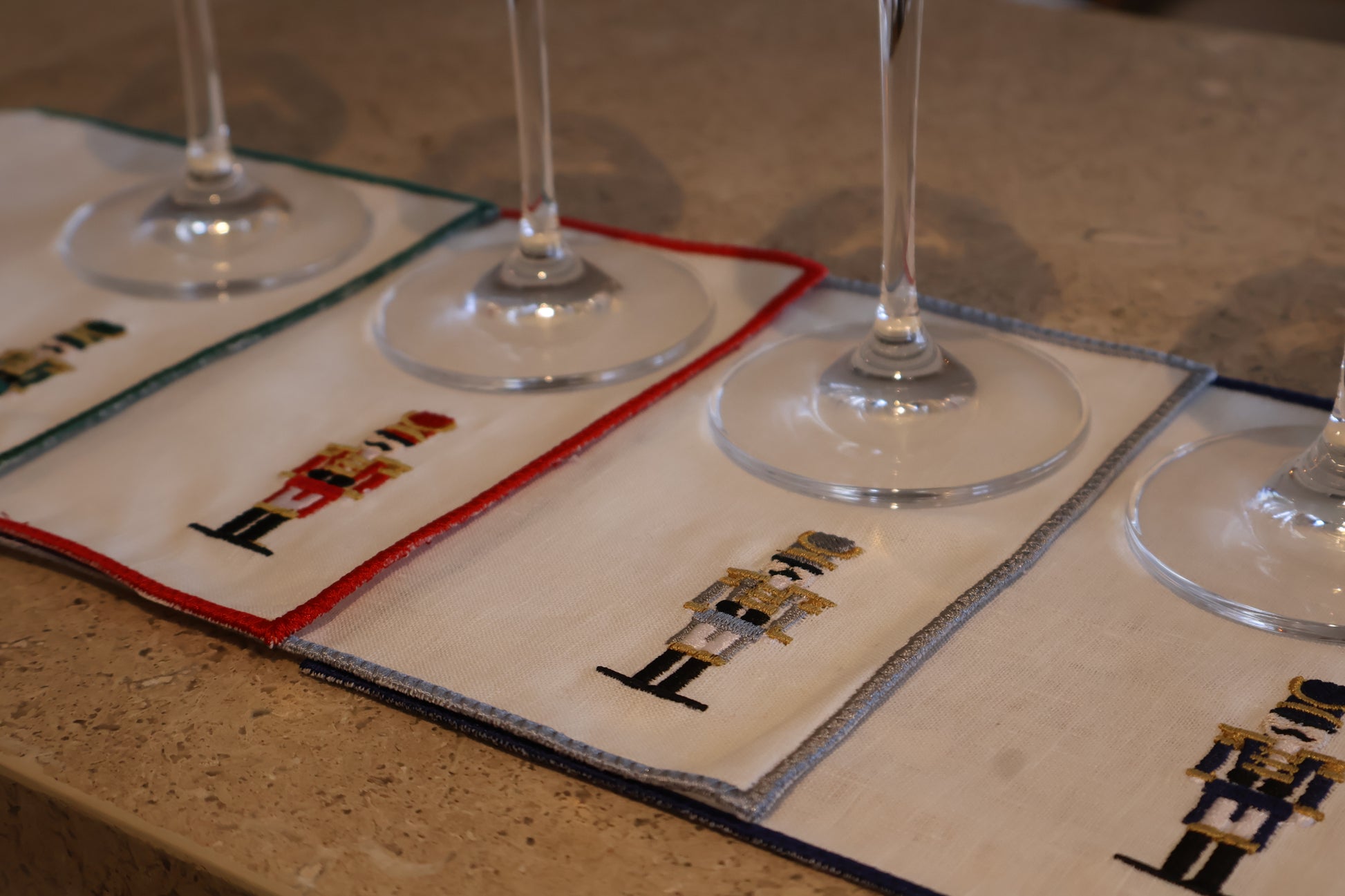 Este set es ideal para darle un toque navideño súper especial a tu mesa. Cada coctelero tiene un cascanuez bordado en un color distinto —rojo, verde, plateado y azul— que juntos se ven increíble y le dan mucha personalidad a cualquier reunión o cena.